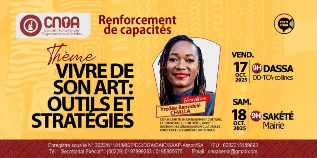 Le Conseil National des Organisations d’Artistes du Bénin (CNOA-Bénin) poursuit son engagement en faveur du renforcement des capacités des artistes avec une nouvelle série de formations placée sous le thème : « Vivre de son art : outils et stratégies». Cette initiative vise à permettre aux artistes béninois de développer des stratégies viables, de professionnaliser leur carrière, de protéger leurs œuvres et d’accéder durablement aux marchés artistiques locaux et internationaux.